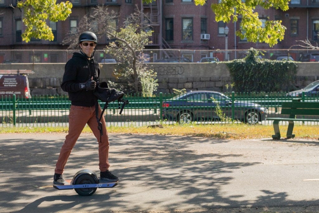 Rider on a single wheel electric skateboard flashes a thumbs up on September 19, 2019.