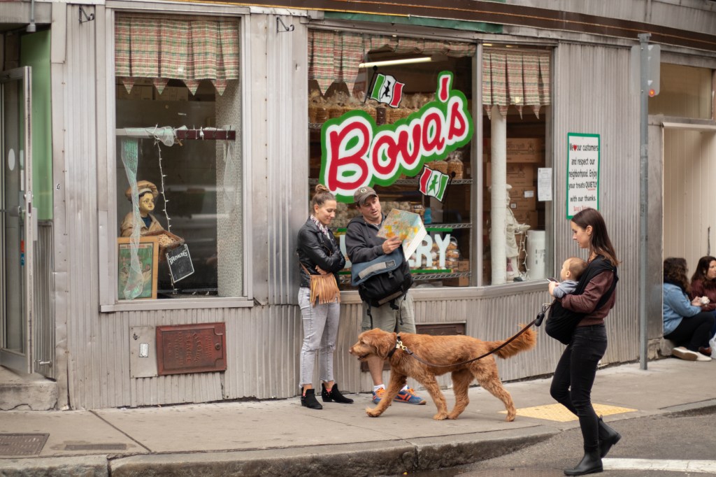 Two people consult a map while a woman walks with a baby and a dog in front of Bova’s in the North End on October 8, 2019.