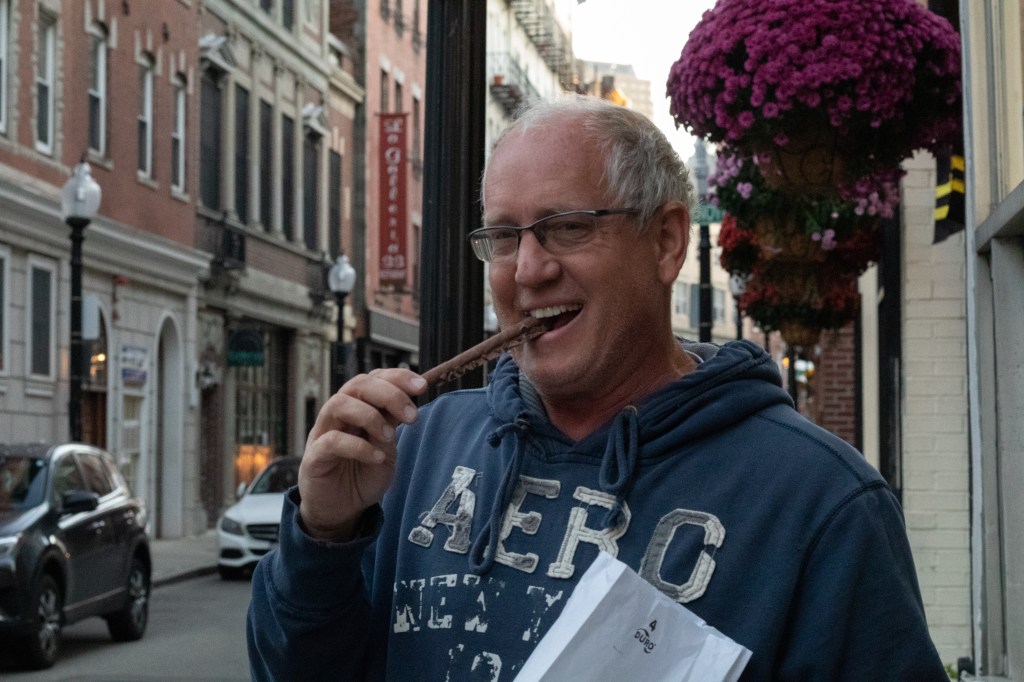 John could hardly wait to start eating his pretzel stick from Bova’s in the North End on October 24, 2019.